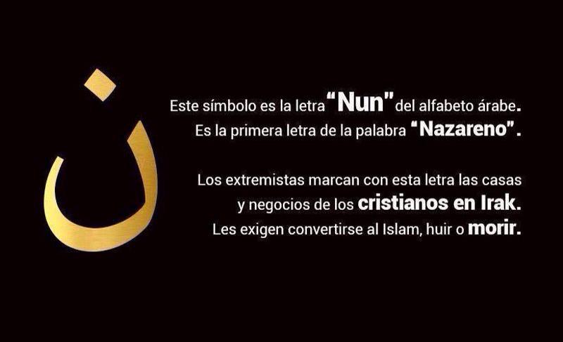 ن, es la vigesimoquinta letra del alfabeto árabe –nun, nuestra N–, y es el garabato con el que los seguidores del califato del Estado Islámico (IS, Islamic State) están marcando las fachadas de las casas y lugares de culto de los cristianos. Es la letra que abrevia «nasrani» (nazareno), con la que los islámicos han designado a los cristianos desde el siglo VII.